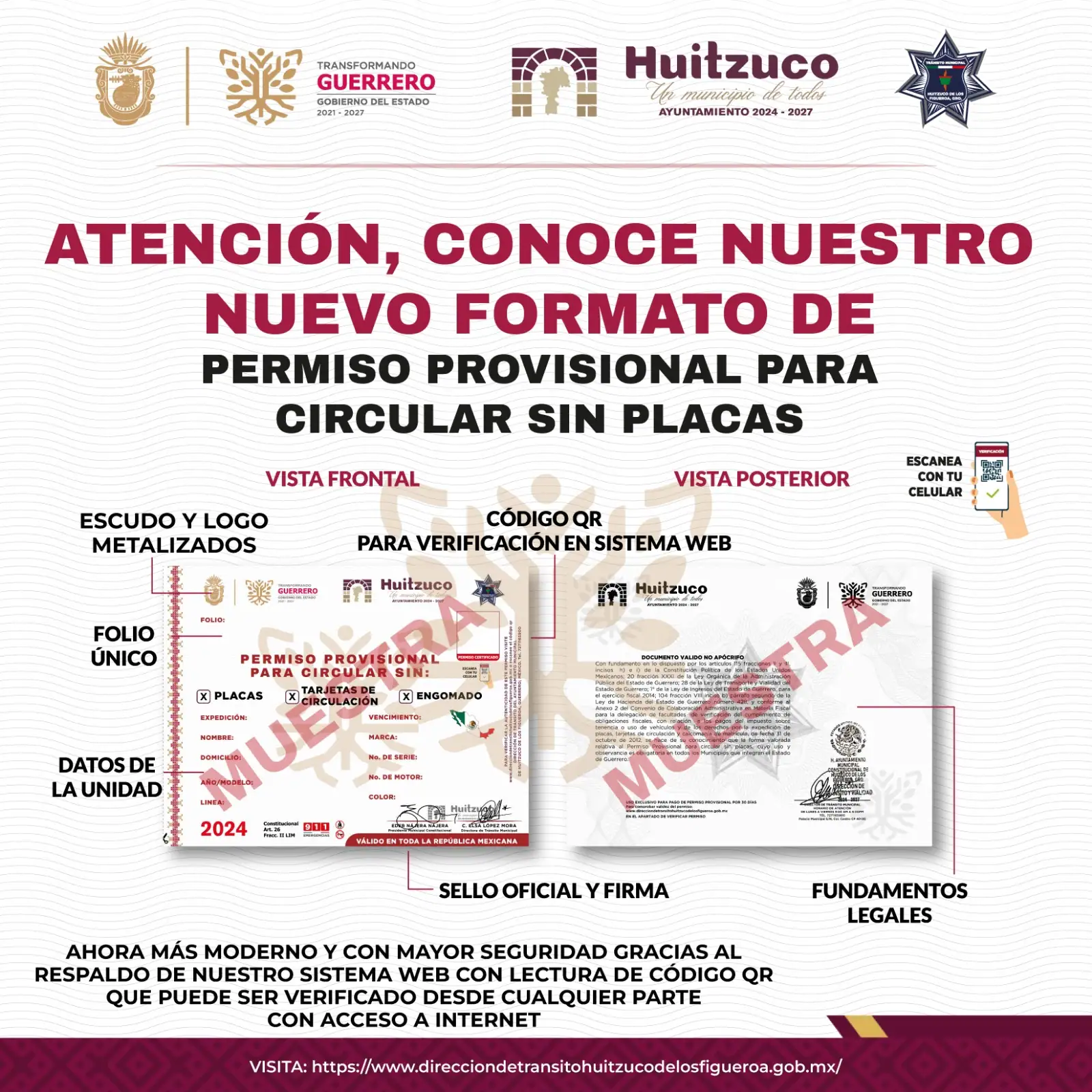 Este sitio web permite la recepción de solicitudes para permisos de circulación. También ofrece información detallada sobre los procedimientos, verificación, autenticidad y validez de los permisos emitidos por el H. Ayuntamiento de Huitzuco de los Figueroa, Guerrero.